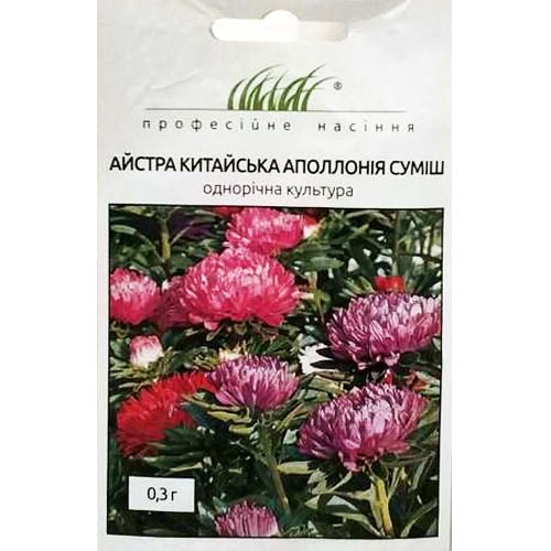 Айстра Аполлнонія, суміш забарвлень — однорічні хризантемоподібні квіти, які формують пірамідальний кущ до 65 см заввишки. На кожній рослині близько десяти квітконосів з великими і ефектними квітами.