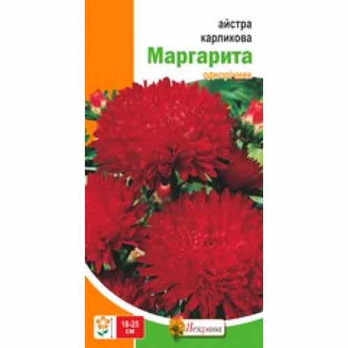 Айстра Маргарита червона – низькорослий сорт однорічних айстр до 25 см заввишки. Кущ росте компактно – до 30 см у діаметрі. Рослина здатна викинути близько 100 суцвіть червоного кольору до 8 см в діаметрі.
