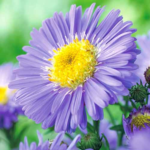 Астра новобельгійська Блю – ефектний представник одного з різновидів сімейства айстрових, що відрізняється пишними квітками дивовижно-синього забарвлення. Безліч фіолетово-блакитних суцвіть з контрастною темно-жовтою серединкою густо всипають щільні компактні кущі з кінця літа і до осені.