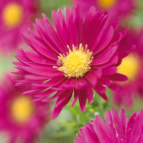 Айстра новобельгійська Дарк Пінк (Aster Novi-Belgii Dark Pink) – оригінальна багаторічна рослина, яка формує густі кущики до 30-40 см заввишки. На пагонах розпускаються ефектні бутони. Вони невеликі, але дуже яскраві – пелюстки забарвлені в насичений рожево-фіолетовий відтінок, серединка сонячно-жовта. Цвітіння триває з кінця літа до пізньої осені. Айстра прекрасно гармонує з іншими цибулинними і ґрунтопокрівними культурами, прикрасить передній край клумб.