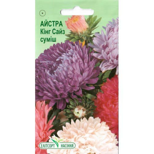 Астра Кінг Сайз суміш забарвлень- популярний однорічник. Кущ компактний, прямостоячий, висотою 70-80 см. Квітки великі, до 12 см у діаметрі, синього забарвлення. Цвіте із середини серпня до настання холодів. Насіння висівають у березні-квітні в теплицю або парник і вирощують через розсаду або у квітні-травні безпосередньо в ґрунт. При температурі 18–21°С сходи з'являються на 10–15 день. Краще росте на сонячних ділянках з живильним ґрунтом. Використовують переважно на зріз, у групових посадках та у квітниках.