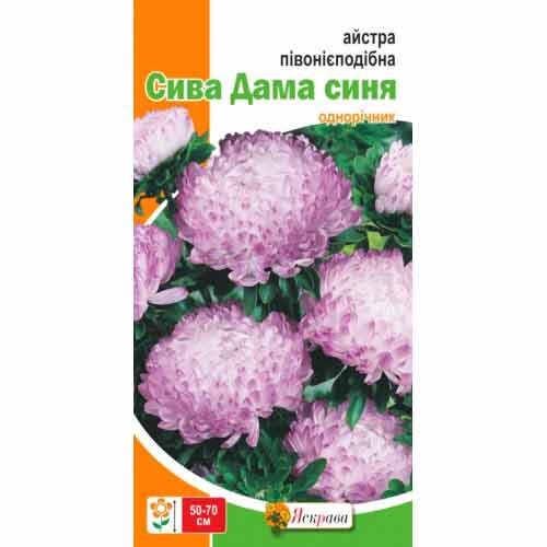 Астра піоноподібна Сива Дама синя - сорт відрізняється неймовірно ніжним забарвленням бутонів. Пелюстки пишних кошиків пофарбовані в білі та бузкові тони, що надає їм виразності з чарівною ніжністю. Сорт чудовий для зрізання, тому що один кущ обдаровує безліччю великих квіток, які стоять у букеті до 18 днів. Справжня знахідка для флористів!