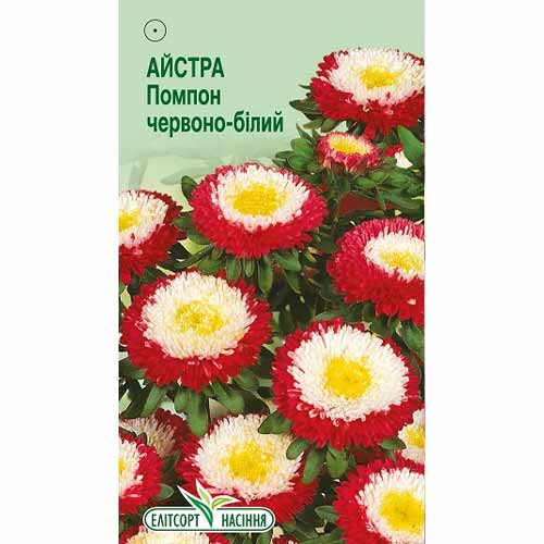 Айстра Помпон червоно-білий - популярний однорічник. Кущ компактний, прямостоячий, висотою до 60 см. Квітки до 5-6 см у діаметрі червоного забарвлення з білим центром. Зацвітає в серпні і цвіте до настання холодів. Насіння висівають у березні-квітні в теплицю або парник і вирощують через розсаду або у квітні-травні безпосередньо в ґрунт при температурі 18-21°С.