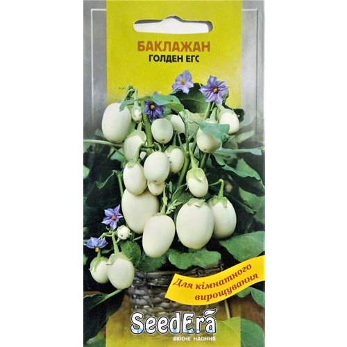 Баклажан декоративний Голден Егс дарує можливість вирощувати улюблений овоч прямо у себе на підвіконні. На невисоких кущиках (30-50 см) спочатку з'являються привабливі фіолетові квіточки. Потім вони перетворюються на невеликі плоди. Спочатку баклажанчики мають білий колір, по мірі дозрівання отримують жовтий, що й обумовлює таку назву сорту. В інтернет-магазині «GradinaMax» ви зможете придбати якісне насіння баклажана декоративного, який має округлу форму і важить не більше 100 г.