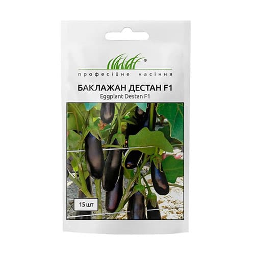 "Баклажан Дестан F1 - ранньостиглий (60-65 днів від висадки розсади) гібрид для вирощування під тимчасовими плівковими укриттями та у відкритому ґрунті (південні регіони). Рослина напіврозкидиста, середньоросла (до 70 см). Стебло з антоціановим забарвленням слабкої інтенсивності, слабоопушене. Плід глянсовий, темно-фіолетового кольору, циліндричний, середньої довжини. Плоди масою до 300 г. М'якуш білувата, без гіркоти. Транспортабельний. Смакові якості відмінні. Рекомендується для домашньої кулінарії та заготовок.