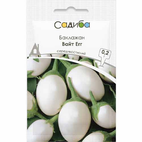 Баклажан Вайт Егг – незвичайний білий сорт. За термінами дозрівання відноситься до середньостиглих, період вегетації складає 110-120 діб. Кущі потужні, до 70 см заввишки. Плоди з білою шкіркою, булавовидні, довжиною 16-20 см та діаметром 8 см. М’якоть біла, довго зберігає щільну консистенцію і не грубіє. Сорт має прекрасні смакові властивості, може використовуватись у всіх видах кулінарної обробки.
