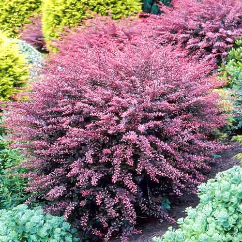Барбарис Тунберга Фламінго – приголомшливої краси сорт з плямистим листям. Крап неоднорідний, різноколірний, він може бути й зеленим, й рожевим, й винно-бордовим. Здалека рослина здається рожево-пурпурною. Зростає така краса під півтора метри. Має широку кулясту крону, тому при висадженні декількох чагарників разом, залиште їм 2-3 м на розростання. Зацвітає в травні – червні, формуючи суцвіття з жовтих квіточок. У вересні на них дозрівають дрібні яскраві ягідки. Замовляйте саджанці барбарису Тунберга Фламінго – вони ефектно виглядатимуть на тлі хвойників та інших декоративно-листяних культур, підходитимуть для акцентних посадок.
