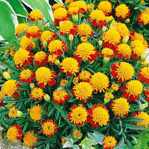 Чорнобривці Тигрові очі – гібриди, яки дуже рідко виростають більш ніж 25 см заввишки. Відрізняються пишним цвітінням, на кожному кущику може розпуститися до 35 бутонів. Вони махрові, жовті округлі «шапочки» лежать на червоних «тарілочках» нижніх пелюсток. Рослина квітне з червня по жовтень, має презентабельний вид та може вирощуватися не тільки на клумбах, але й у контейнерах. Гібриди стійкі до негативних факторів впливу та не потребують пильної уваги.