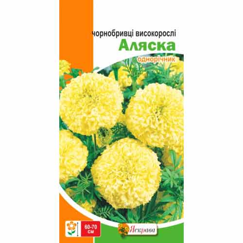 Чорнобривцi Аляска – дуже ефектний сорт висотою близько 80 см. На міцних квітконосах розпускаються кулясті махрові квіти діаметром 10 см незвичайного жовто-кремового кольору. Культури можна висаджувати на рабатках та клумбах, невеликими групами або в оточені низьких сортів із контрастним забарвленням.