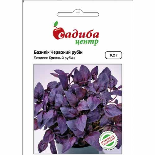 Базилік Червоний рубін – чудовий сорт з глянсовим темно-фіолетовим листям близько 40 см заввишки. За термінами дозрівання він відноситься до середньостиглих – листя буде готове за 65-70 днів після посіву. Врожайність висока – загальна маса куща може досягати 250 г. В кулінарії листя використовують в свіжому та сушеному вигляді. Додають в салати та другі страви, соуси та маринади.