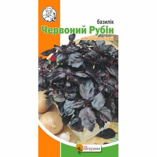 Базилік Червоний Рубін – чудовий сорт з глянсовим темно-фіолетовим листям близько 40 см заввишки. За термінами дозрівання він відноситься до середньостиглих – листя готове за 65-70 днів після посіву. Врожайність висока – загальна маса куща може досягати 250 г. В кулінарії листя використовують в свіжому та сушеному вигляді. Додають в салати та другі страви, соуси та маринади.