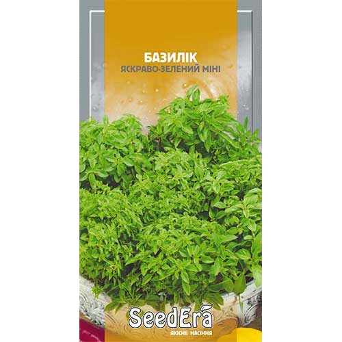Базилік Міні яскраво-зелений - компактний кущ, висотою 25 - 40 см. Листя у міні базиліка дрібні з чіткими зубчастими краями. Забарвлення: насичено-зелене. Вегетаційний період від сходів до появи центрального суцвіття 60-65 днів. Вирощують через розсаду і посівом насіння в грунт. Аромат у трави дуже інтенсивний з яскравим, специфічним присмаком, який надійно зберігається і в сухих рослинах. Базилік широко використовують в свіжому і сушеному вигляді, як приправу при консервуванні овочів, при приготуванні м'яса і риби. Міні базилік містить величезну кількість ефірних масел, які позитивно впливають на роботу всього організму в цілому. У нашому інтернет-магазині тільки якісне насіння та саджанці.