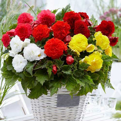 Пелюстки бахромчатої бегонії за своєю формою нагадують гвоздичні. Висота культури сягає 30 см. Пелюстки забарвлені в білі, жовті, червоні та оранжеві відтінки. На відкритих сонячних ділянках бегонія цвіте максимально пишно і довго. Купуйте бульби бахромчатої бегонії різних відтінків для прикраси клумб і балконів.