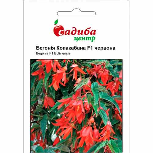 Бегонія Копакабана червона F1 - яскрава та ефектна однорічна рослина. На клумбах вона стелиться, у вазонах утворює каскад завдяки великій кількості бічних пагонів. Квіти дзвоноподібної форми та насиченого червоного кольору, довжиною до 7 см. На відміну від інших видів бегоній, добре витримує і яскраве сонце, і півтінь.