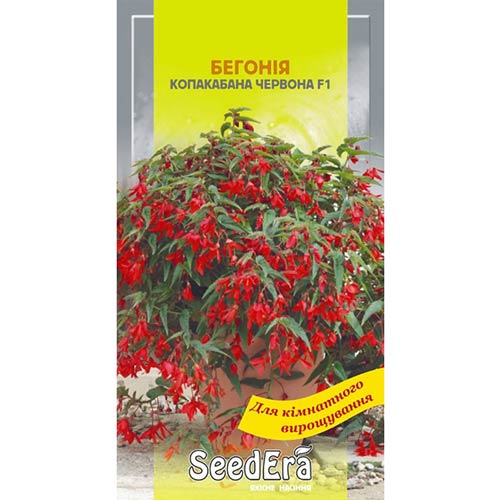Бегонія Копакабана червона F1 – ампельна однорічна культура до 30 см заввишки. Кущики досить потужні, по мірі розвитку на них формується безліч бічних пагонів. Діаметр дорослої рослини – 50-70 см. Під час цвітіння бегонія повністю вкривається квітами, схожими на фуксію, діаметром до 7 см. Вона не пошкоджується дощем, квітне з початку літа до заморозків. Підходить для оформлення великих кашпо, вазонів та квітників.