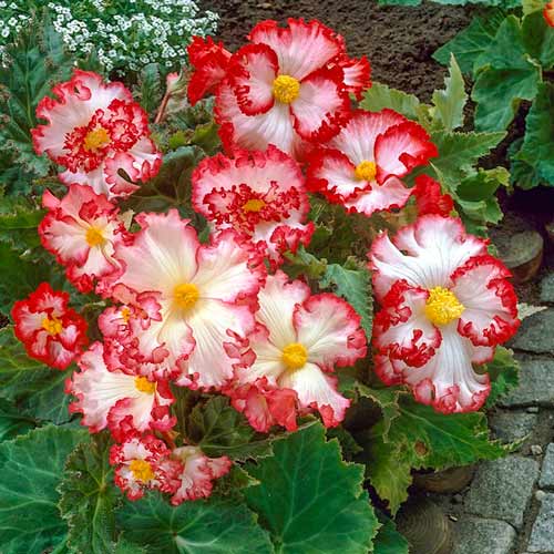 Бегонія Кріспа Маргіната Вайт/Ред (Begonia Crispa/Marg White/Red) – чарівна кімнатна або контейнерне рослина. Великі, до 15 см бутони абсолютно білого кольору складаються з ніжних пелюсток з гофрованим краєм і вишневої облямівкою. Цвітіння триває з червня по жовтень. Висота куща складає 30 см. Листя велике, різьблене. В саду вирощується у вазонах і контейнерах, можливе поєднання із ампельними рослинами.
