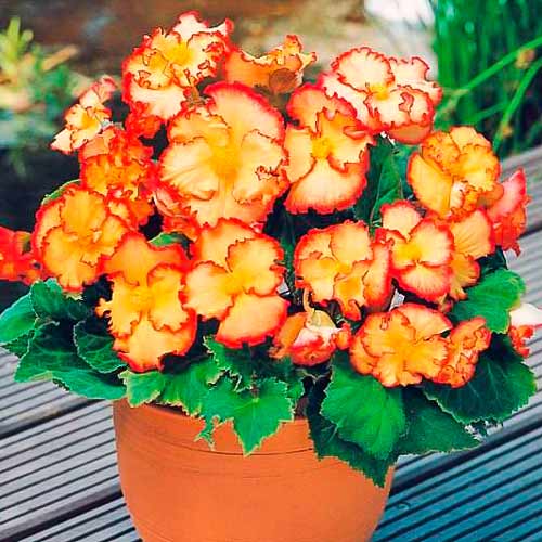 Бегонія Кріспа Маргіната Єллоу/Ред (Begonia Crispa/Marg Yellow/Red) – це невисока, до 30 см рослина з великими квітами. Незвичайні пелюстки лимонно-жовтого кольору мають хвилястий край і яскраву червону облямівку. Безперервне цвітіння триває з червня по жовтень. Культура відмінно поєднується з іншими сортами бегонії, подібними по висоті, ампельними рослинами і сланкими однорічниками.
