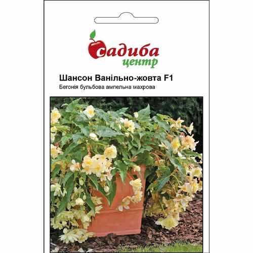 Бегонія Шансон ванільно-жовта F1 – середня за розмірами ампельна махрова квітка, стійка до несприятливих умов. На кущиках зазвичай формується по 5-8 пагонів. Довгі квітконоси (до 45-50 см) розташовані у пазухах листя. Діаметр бутонів складає 6-8 см, вони правильної форми, а їх пелюстки забарвлені у ніжний жовтий відтінок. Квіти доречно виглядають у кашпо та високих вазонах.