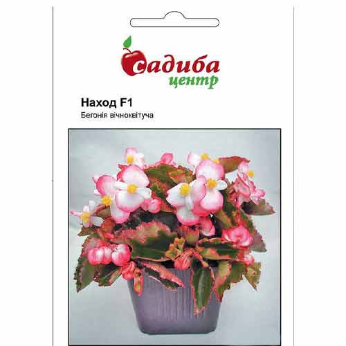 Бегонія вічноквітуча Наход F1 – ніжна культура із сильно розгалуженими кущиками до 25-30 см заввишки. Пелюстки білосніжні із помітною рожевою облямівкою, серединка жовта, опукла. Листя темно-зелене, має таку ж облямівку, як і пелюстки. Переваги рослини – тривале цвітіння за будь-якої погоди. Бегонія здатна самоочищатися, тому у зрізання зів’ялих бутонів необхідності немає – вони самі відпадають, а на їх місці виростають нові.