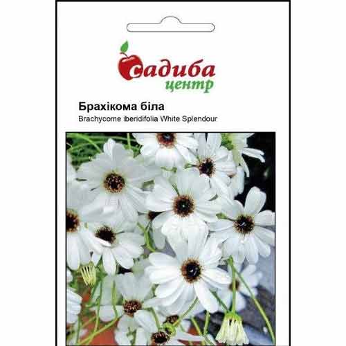 Брахікома біла – витончений однорічник із компактними гіллястими кущиками. На стеблах довжиною 20 см розквітають білосніжні бутони діаметром 3-4 см, у них дуже приємний аромат. Пік декоративності триває з початку літа до середини осені. Квітка гармонійно виглядає на клумбах, рабатках, бордюрах та у альпінаріях.