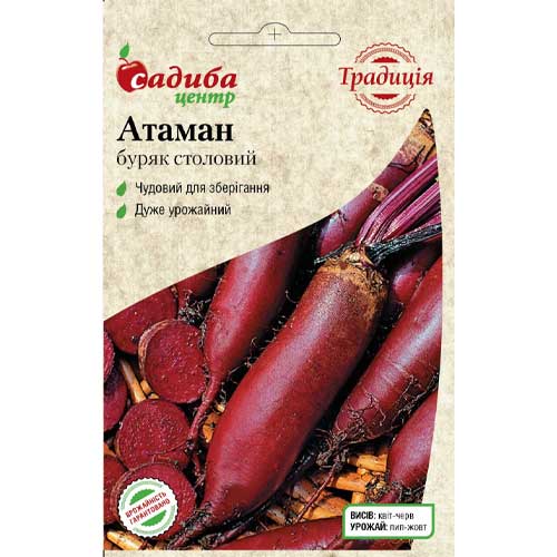 Буряк столовий Атаман - один із найурожайніших сортів буряка. Насіння сіють у період з квітня по червень, коли мине загроза нічних заморозків. Глибина посадки 3-4 сантиметри. Найкраще підходять пухкі, слабокислі ґрунти. Коренеплоди виростають однорідні, циліндричної форми, масою до 300 грамів. Буряк темно-вишневого кольору з тонкою м'якою шкіркою. Атаман холодостійкий, може довго зберігатися в холодильнику або підвалі, причому зберігає свій вишуканий смак. Цей сорт чудово підходить для приготування найрізноманітніших страв, заморожування та консервації.
