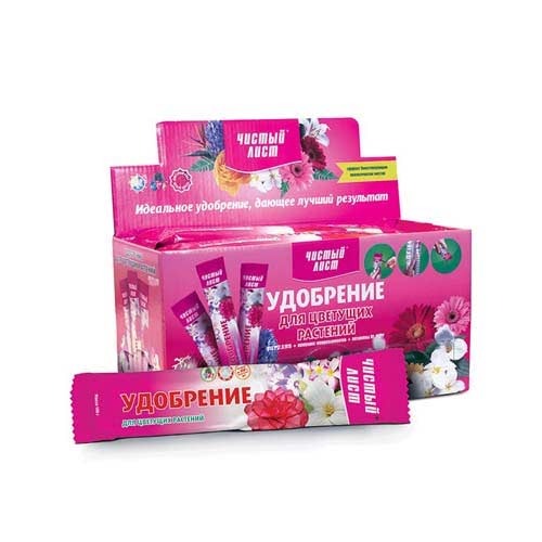 Чистий Лист для квітучих рослин – мінеральний комплекс, який не тільки забезпечує культури необхідним харчуванням, але й стимулює пишне і тривале цвітіння. Допомагає формувати нові пагони і бутони, зміцнює коріння культур. Використовувати його можна майже з будь-якої органікою.