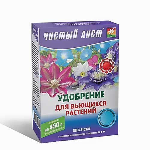 Чистий Лист для витких рослин - кристалічний препарат, яким потрібно підгодовувати рослини протягом усього вегетаційного періоду. Засіб корисний тим, що покращує стійкість рослин до хвороб, поганих погодних умов.
