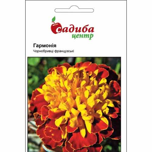Чорнобривці французькі Гармонія - однорічна рослина, висотою до 20 см. Суцвіття - кошики, дуже яскраві, жовті, помаранчеві, червонувато-коричневі або строкаті, поодинокі або зібрані в складні суцвіття. Цвітуть рясно з червня до заморозків. У відкритий ґрунт висівають наприкінці травня – на початку червня. Сходи з'являються на 5-10 день після посіву. Рослини невибагливі, швидкорослі, світло і теплолюбні, посухостійкі. Оптимальна температура росту молодих рослин становить 18-20 °С. Добре виглядають у групових посадках, клумбах та рабатках.
