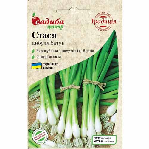 Цибуля батун Стася - чудовий перспективний сорт вітчизняної селекції. Рослина багаторічна, невибаглива, зимостійка, швидко формує зелену масу. Від відростання листя до технічної стиглості – 30-40 днів. Перо довге, з міцним восковим нальотом, соковите та гостре на смак, містить у два рази більше вітаміну С, ніж ріпчаста цибуля. Висівають у першій декаді квітня на глибину 1-2 см. Використовується для свіжого споживання та переробки.