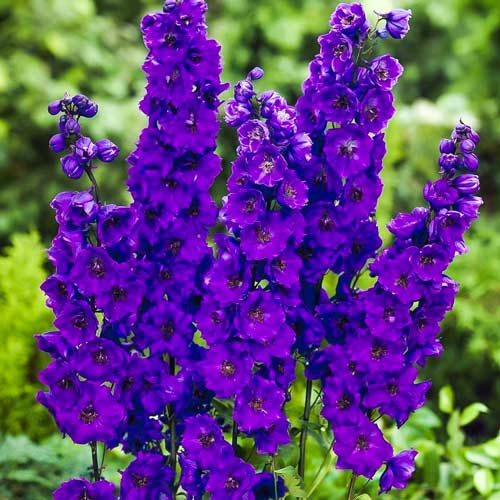 Дельфініум Пацифік Гіант Блек Найт – дуже виразний сорт з квітками насиченого синьо-фіолетового забарвлення діаметром до 7 см. Вони густо вкривають прямостоячі квітконоси, кисті можуть сягати метрової довжини. На одному кущі формується по 10-15 пагонів. Пік декоративності приходиться на червень – липень. Якщо після цвітіння всі квітконоси зрізати трохи вище рівня ґрунту, то можна добитися повторного цвітіння на початку осені. Висота культури сягає 180 см. Вона прекрасно виглядає в центрі клумби або на другому плані квітників. Придатна для зрізки – не втрачає свіжості близько 10 днів.