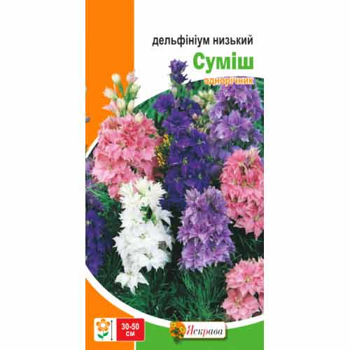 Дельфініум, суміш забарвлень – унікальний набір насіння багаторічників з оригінальними великими суцвіттями для декорування садових клумб і рабаток. Високі стебла дельфініума зі щільним султаном барвистих квітів підходять для вирощування біля огорож, стін садових будівель. Квіти утворюють мальовничу групу при висаджуванні на газоні. Рослину можна вирощувати для зрізання на букети.