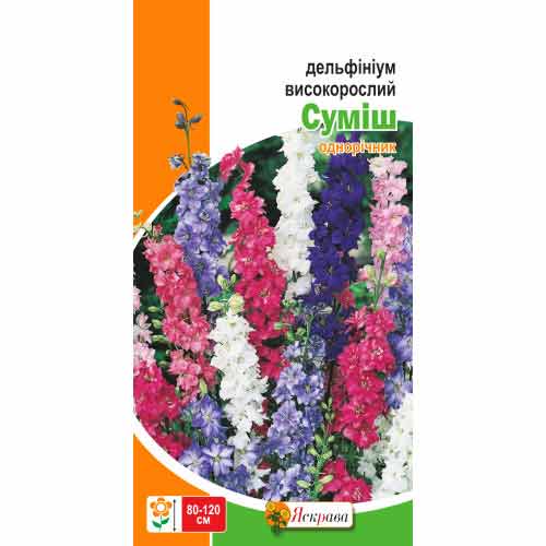 Дельфініум високий, суміш забарвлень – набір насіння ефектних садових рослин, які зацвітають у першій половині літа. Забарвлення високих султанів може варіюватися від білого тону до темно-бузкового або синього. Однорічний висіяний дельфініум легко сходить з опалого насіння, самовисів можна пересаджувати в постійні клумби.