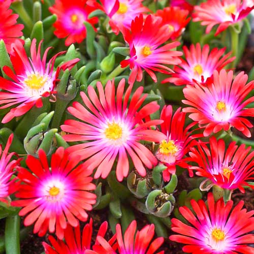 Делосперма Джевел оф Десерт Гарнет – невисокий багаторічник з цікавими бутонами, що ніби світяться. Такий ефект виникає завдяки забарвленню пелюсток. Велика їх частина – гранатового відтінку, ближче до серединки він переходить в цикламеновий, а той, у свою чергу, в білий, який оточує кільцем медово-жовті тичинки. Листочки соковиті, подовжені, глибокого зеленого кольору з глянсовим блиском. Максимальна висота рослини – 30 см, а діаметр – до 20 см. Цвітіння настає на початку літа. Замовте саджанці делосперми Джевел оф Десерт Гарнет й саджайте їх в альпінаріях або рокаріях, на невеликих моноклумбах.