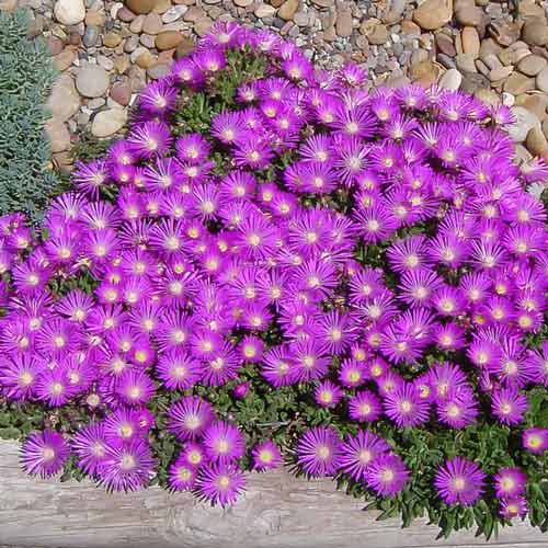 Делосперма Тейбл Маунтін – чудовий ґрунтопокрівник висотою не більше 15 см. Під час цвітіння в травні – червні він настільки густо покривається рожево-бузковими бутонами з біло-жовтими серединками, що зелені стає майже не видно. Діаметр однієї квітки – 4-5 см. Листя-циліндрики темні, сіро-зелені, соковиті. Діаметр чагарнику при хорошому догляді може досягати 45 см. Купуйте саджанці делосперми Тейбл Маунтін – це прекрасний варіант для сухих клумб на яскравому сонці.
