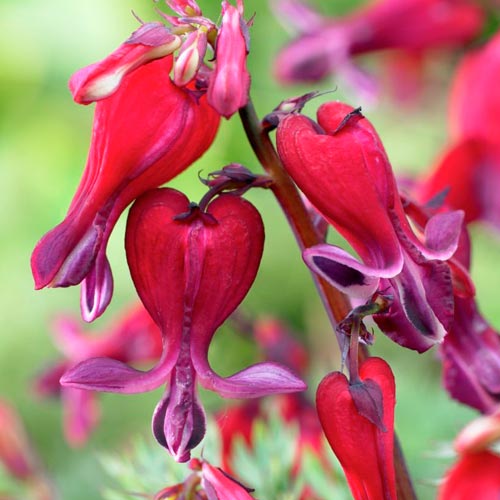 Дицентра Фаєр Айленд (Dicentra Fire Island) – витончений та компактний сорт до 30-40 см заввишки. У нього м’ясисте кореневище, яке глибоко проникає в землю. Листя дуже декоративне, ніжне й ажурне. Квіточки діаметром 2 см нагадують серце, пелюстки яскраво-червоні, а їх кінчики – лілові. Вони зібрані у виразні пониклі суцвіття. Дицентру розміщують поодиноко та групами на тлі газону або хвойних дерев та чагарників. Вона гарно виглядає поряд із контрастними сортами.