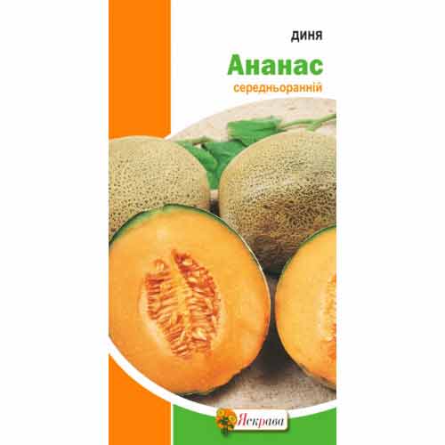 Диня Ананас - має незвичайний присмак тропічного фрукта. Відмінні смакові якості та досконала невибагливість сорту з чудовою врожайністю у різних регіонах України роблять його дуже привабливим для всіх садівників. Кожен любитель дині гідно оцінить цей сорт, смакуючи його плоди у свіжому вигляді і приготовлені з них десерти. Плоди розміром більше середньої округлої форми, мають масу до 2,5 кг. М'якуш соковитий кремового відтінку, має легку маслянистість з насиченим ароматом ананаса, шкірка щільна в легку сіточку. Термін дозрівання – 80 днів. Сорт витривалий до температурних перепадів і стійкий до ряду основних хвороб баштанних.