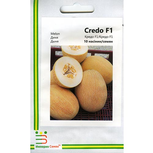 Диня Кредо - гібрид має відмінне поєднання ранньостиглості, якості плодів та стійкості до захворювань. Плоди однорідні, вирівняні за формою та розміром, вагою від 2 до 2,5 кг, жовтого кольору з привабливою сіткою. М'якуш білого кольору з приємним ароматом і солодким смаком.