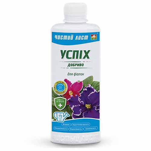 Добриво Чистий лист (Успіх) для фіалок - складне мінеральне добриво з комплексом активних речовин, амінокислот, бурштинової кислоти та макро та мікроелементів у доступній формі для рослин, що забезпечує повним харчуванням усі рослини та може бути використане в будь-якій системі поливу (крапельне зрошення, дощування) , гідропоніка і т.д.).