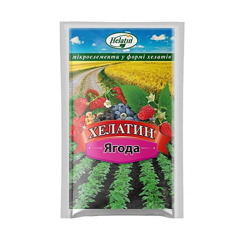 Хелатин Ягода - універсальне водорозчинне добриво, яке містить увесь необхідний комплекс мікроелементів у доступній формі, у вигляді хелатів, для росту і розвитку ягідних культур. Ознаки нестачі добрива: засиханні краю листка, дрібному листі, скручуванні, почервонінні та обпаданні листя.