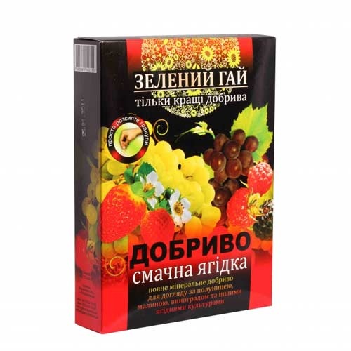 Зелена гай Смачна ягідка – комплексний мінеральний препарат для здорового росту та підвищення врожайності ягідних: полуниці, винограду, ожини, малини, смородини та ін. В основі високих урожаїв – правильні підживлення. Завдяки добривам для ягідних, буде забезпечено рясне цвітіння, зав'язуваність плодів. Зав'язь не обсипатиметься, а плоди добре наливатимуться і швидко дозріватимуть. Додаткові мікроелементи у складі добрива – дають ягідним здорове зростання та високу опірність хворобам. В упаковці – подарунок: мірна ємність та пластикові рукавички.