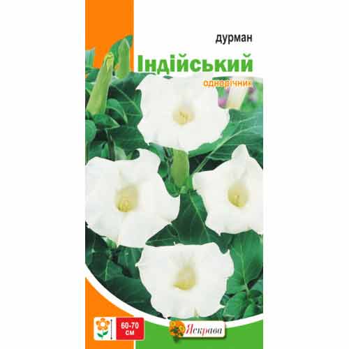 Дурман індійський білий – ефектна рослина з величезними білими дзвіночками, спрямованими вгору, яку висаджують переважно у декоративні діжечки, контейнери. Квіти мають приємний аромат, після цвітіння утворюються великі кулясті плоди, посипані густими шипами. Насіння велике, округле, темно-шоколадного відтінку. Усі частини дивовижної рослини містять отруйні речовини, тому при висадженні та вирощуванні дурману варто дотримуватися обережності.