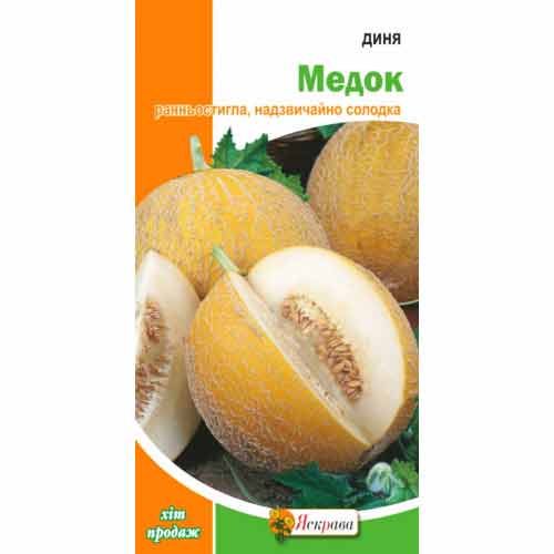 Диня Медок – ранньостиглий сорт культури з феноменально солодкими, які мають медовий присмак, плодами. Менше ніж три місяці потрібно рослині для їхнього повного дозрівання. Досить великі плоди (деякі досягають 5 кг), мають соковитий і ніжний м'якуш.