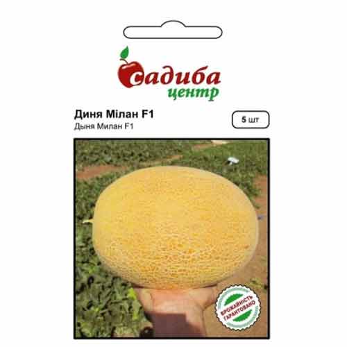 Диня Мілан F1 – гібрид із ранням терміном дозрівання, який відноситься до сортотипу Ананас. Від пересадки розсади до збору врожаю проходить 65-70 діб. Культуру можна вирощувати у низьких тунелях та відкритому ґрунті. На потужних пагонах формується 4-5 плодів масою до 2,5-4 кг. Вони овальні, із темно-жовтою сітчастою шкіркою. М’якуш хрусткий, щільний, помаранчевий, дуже солодкий із характерним ароматом. Рівень цукру за шкалою Брікс досягає 14-16%.
