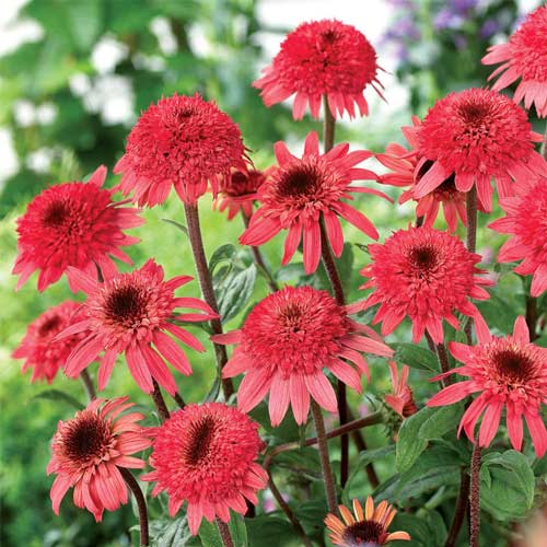 Ехінацея Корал Риф – прекрасний кореневищний багаторічник з величезними бутонами. Його висота сягає 70-90 см. Стебла прямі й потужні, не гнуться під тягарем махрових квіток. У них цікаве й яскраве забарвлення. Краєві пелюстки – коралові, серединні – темніші, вишнево-коричневі. Розпускаються з середини літа до осені. Замовляйте кореневища ехінацеї Корал Риф для висадження групами посеред газону, прикраси другого плану міксбордерів, а також отриманні шикарної зрізки.