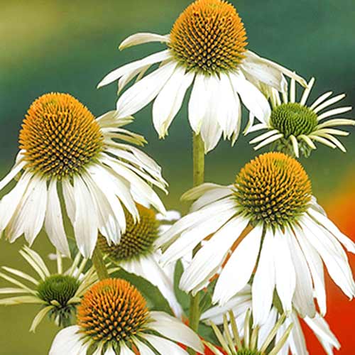 Ехінацея пурпурна Альба (Echineacea Alba) – зворушлива квітка висотою близько 80 см. У неї темно-зелене зубчасте листя. У липні – вересні на квітконосах формуються бутони з помаранчевими опуклими голчастими серединками та ледь пониклими білими пелюстками. Діаметр корзинки складає 15 см. Цвітіння триває майже два місяці, починається в липні. Ехінацею можна розміщувати невеликими групами та поряд із низькими багаторічниками біля крупномірів.