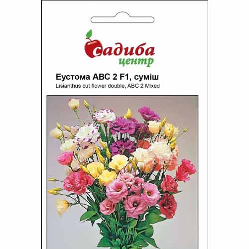 Еустома АВС 2 F1, суміш - великоквіткова, махрова, однорічна елегантна рослина. Відрізняється середньо-раннім цвітінням. Це наймодніша квітка в будь-якому саду або будинку, яка підкорила серця всіх відомих флористів по всьому світу. Серія АВС характеризується пластичністю в термінах вирощування, широкою палітрою кольорів. Ця серія є найкращою для отримання квітів для зрізу, у США вона була номінована на кілька премій у категорії "Найкращі квіти для зрізу". Формує міцні стебла висотою 90-110 см. Квітки великі, махрові, 5-6 см у діаметрі, за формою нагадують троянди. Насіння сіють у ящики в грудні, не присипають землею, а злегка притискають до ґрунту, накривають склом. Ґрунт підтримують постійно зволоженим. Зацвітає через 22-26 тижнів після висіву. Чудово зберігає свіжий вигляд після зрізу і довго стоїть у букетах. Можна висаджувати в саду.