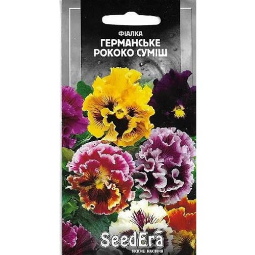 Фіалка (віола, братки) Германське Рококо – дивовижна за красою суміш квітів різноманітних забарвлень. Рослини володіють всіма ознаками, властивими однойменному стилю: пишністю, вигадливістю і ніжністю. Квітки красивої форми, махрові, з гофрованим краєм, з жовтою серединкою, двох- або триколірні. Культура холодостійка, цвіте рясно і тривало. Ідеально підходить для прикраси парків, дворів, оформлення вікон, балконів, лоджій.