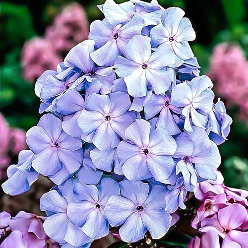 Флокс метельчатий Блю Бой – трав'янистий багаторічник із сімейства синюхових. Він зростає до 80-100 см. Пагони прямостоячі, потужні, покриті загостреними листочками. Бутони діаметром 3,5 см зібрані в округлі суцвіття. У пелюсток дивне лавандово-блакитне забарвлення, світліший центр та маленьке фіолетове кілечко довкола серединки. Цвітіння настає у другій половині літа. Замовляйте саджанці флоксу метельчатого Блю Бой та висаджуйте їх невеликими групами на тлі газону, вони добре підходять для міксбордерів й садів у стилі кантрі. Культура прекрасно поєднується з дзвіночками, рудбекіями й гвоздиками, довго стоїть в зрізці.