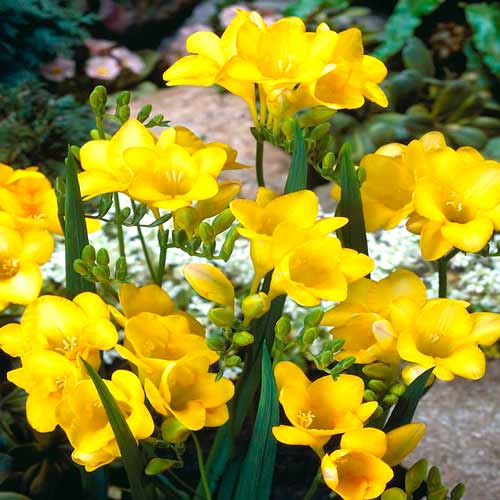 Фрезія Єллоу (Freesia Yellow) – цибулинна квітка з ошатними сонячно-жовтими пелюстками і ніжним ароматом. Діаметр її бутонів дорівнює 8 см, а висота квітконосів – 30 см. Цвіте культура у відкритому ґрунті майже ціле літо, в домашніх умовах можна отримати бутони до весняних свят. Красуня відноситься до сімейства ірисових, добре розвивається в кліматі України і не потребує пильної уваги від господаря. Нею можна прикрасити багаторівневі квітники, високі бордюри, міксувати з іншими рослинами. Культура довго стоїть у зрізці, в домашніх умовах можуть розпускатися майже цілий рік. Купуйте цибулини фрезії Єллоу та залучіть на свою ділянку сонячний настрій!