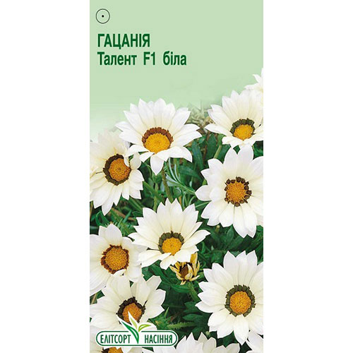 Гацанія Талент біла F1 - красива рослина, яку багато садівників вирощують як однорічник. Володіє прямостоячими стеблами до 30 сантиметрів у висоту. У період цвітіння на акуратному кущику з'являються досить великі білі квіти.